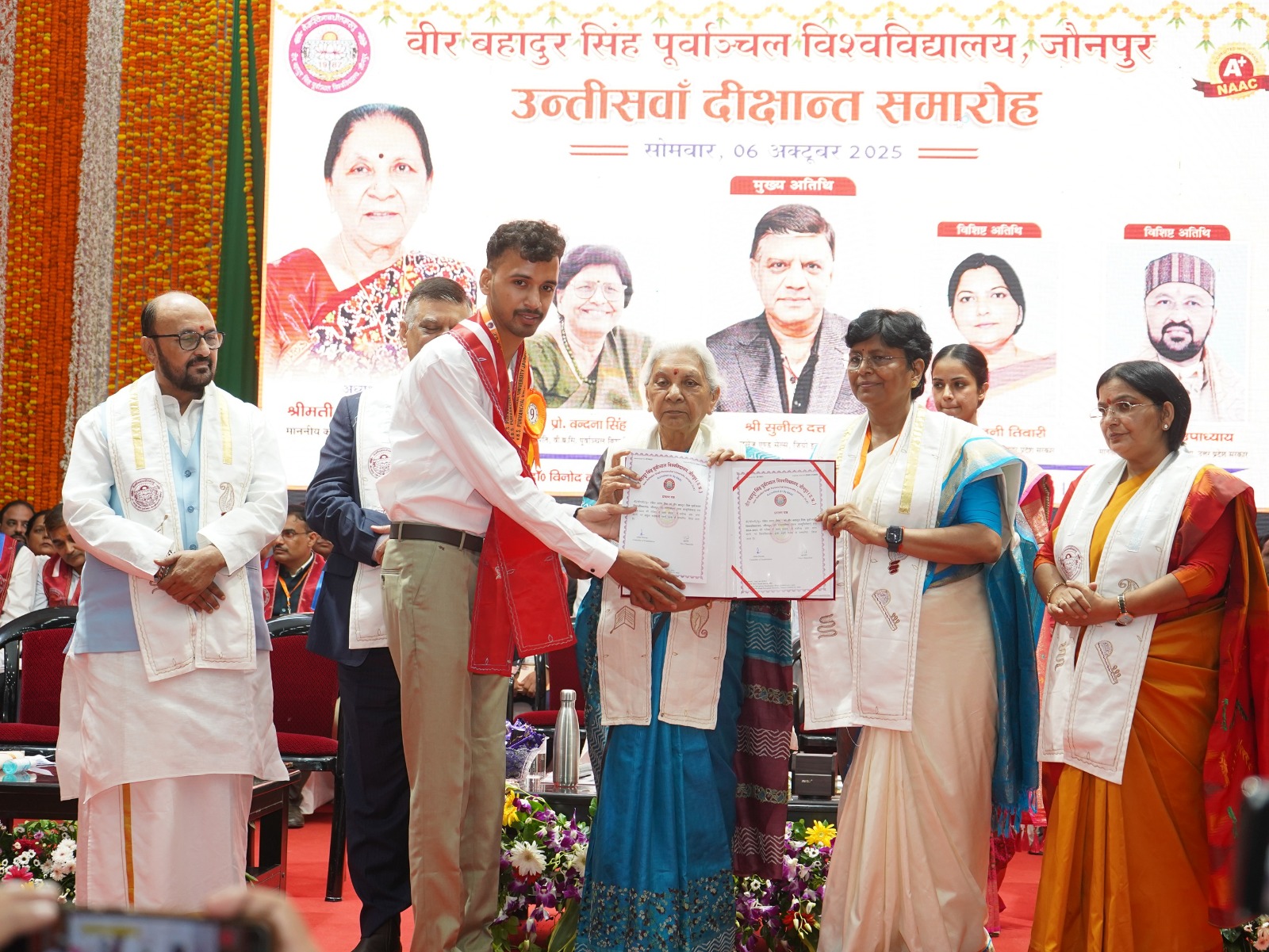 जौनपुर – वीर बहादुर सिंह पूर्वांचल विश्वविद्यालय का 29 वॉ दीक्षांत समारोह सोमवार को महंत अवेद्यनाथ संगोष्ठी भवन में संपन्न हुआ। इस अवसर पर माननीय कुलाधिपति एवं श्री राज्यपाल उत्तर प्रदेश श्रीमती आनंदीबेन पटेल जी ने सर्वोच्च अंक प्राप्त करने वाले स्नातक एवं स्नातकोत्तर के 79 मेधावियों को 80 स्वर्ण पदक प्रदान किया। साथ ही 445 शोधार्थियों को पी.एचडी. और दो को डीलिट की उपाधि दी गई। इस वर्ष विभिन्न पाठ्यक्रमों में स्नातक और परास्नातक के 80141 विद्यार्थियों को डिग्री प्रदान की गई। मा0 कुलाधिपति जी ने दीक्षांत समारोह के मुख्य अतिथि रिलायंस जियो इन्फोकॉम लिमिटेड के डिवाइसेज एंड सेल्स प्रेसीडेंट सुनील दत्त को डी.एससी. की मानद उपाधि दी।